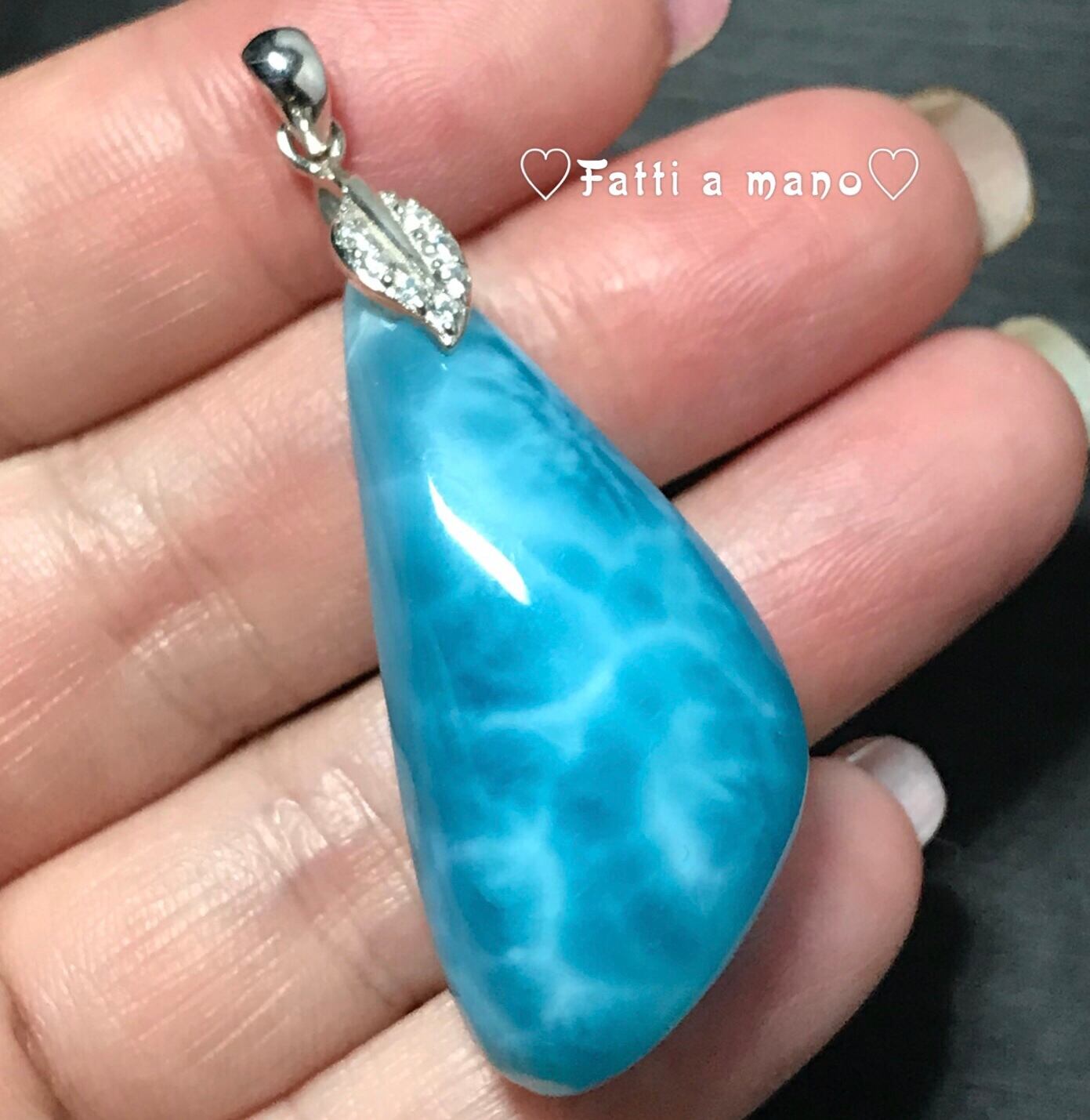 素材:ドミニカ共和国直輸入 100%天然ラリマー(約42*20*15.5mm) 金属部分はsilver925(ホワイトゴールドコーティング)です。