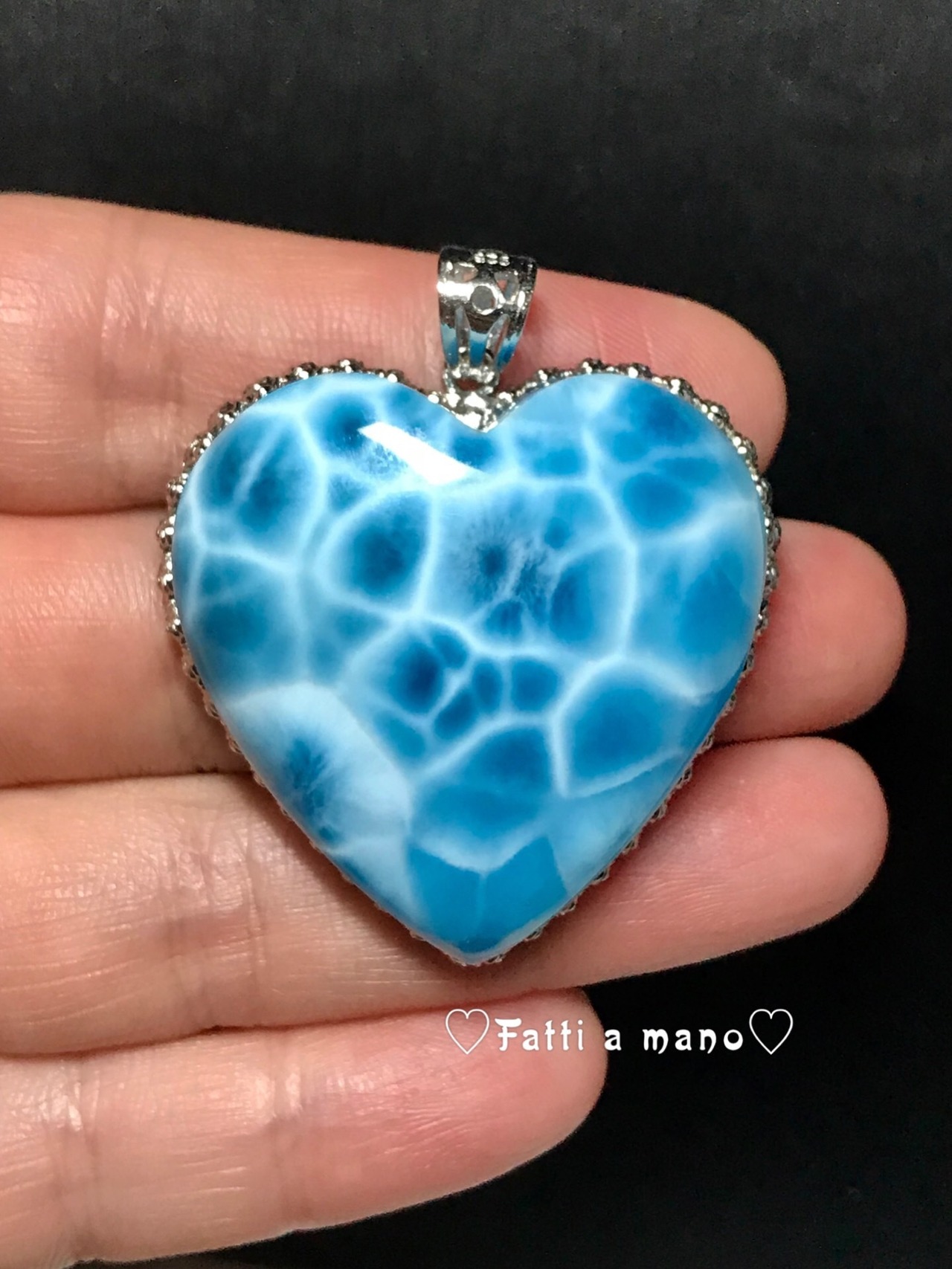 素材:ドミニカ共和国直輸入 100%天然ラリマー(約36.3*38.5*11.1mm) 金属部分はsilver925(ホワイトゴールドコーティング)です。