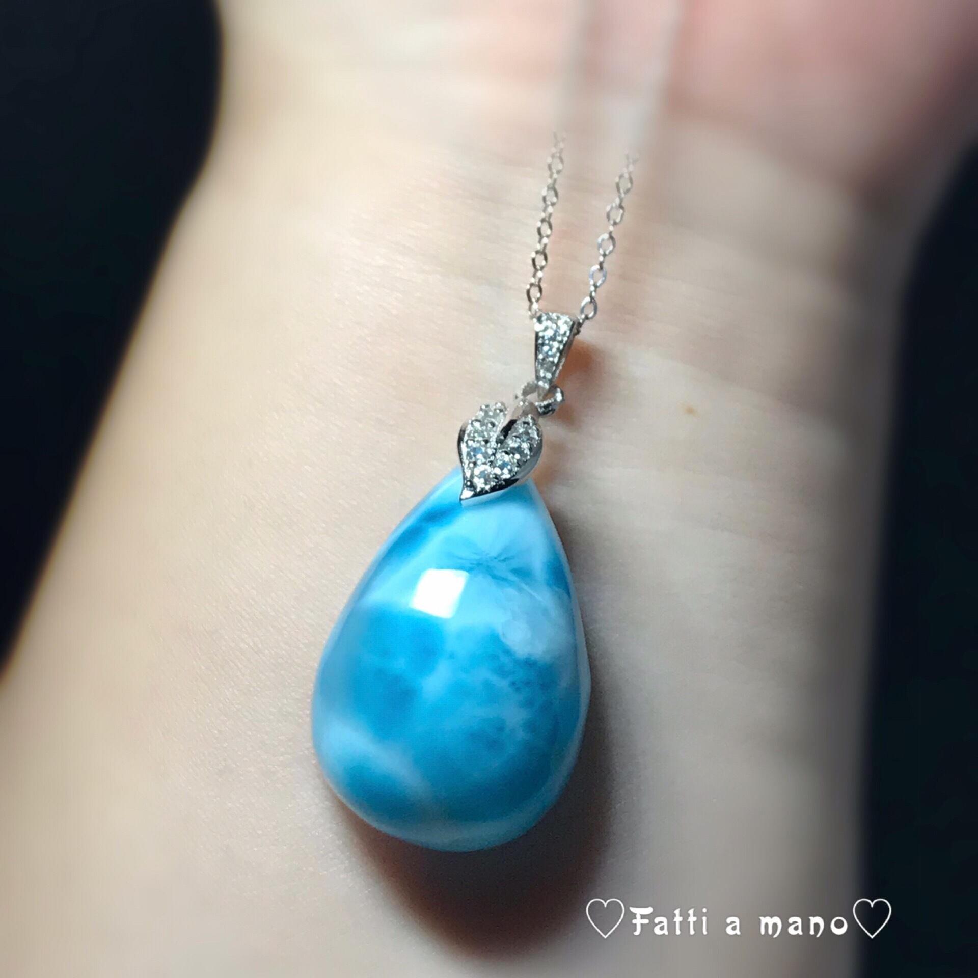 素材:ドミニカ共和国直輸入 100%天然ラリマー(約28.1*19*13.3mm) 金属部分はsilver925(ホワイトゴールドコーティング)です。