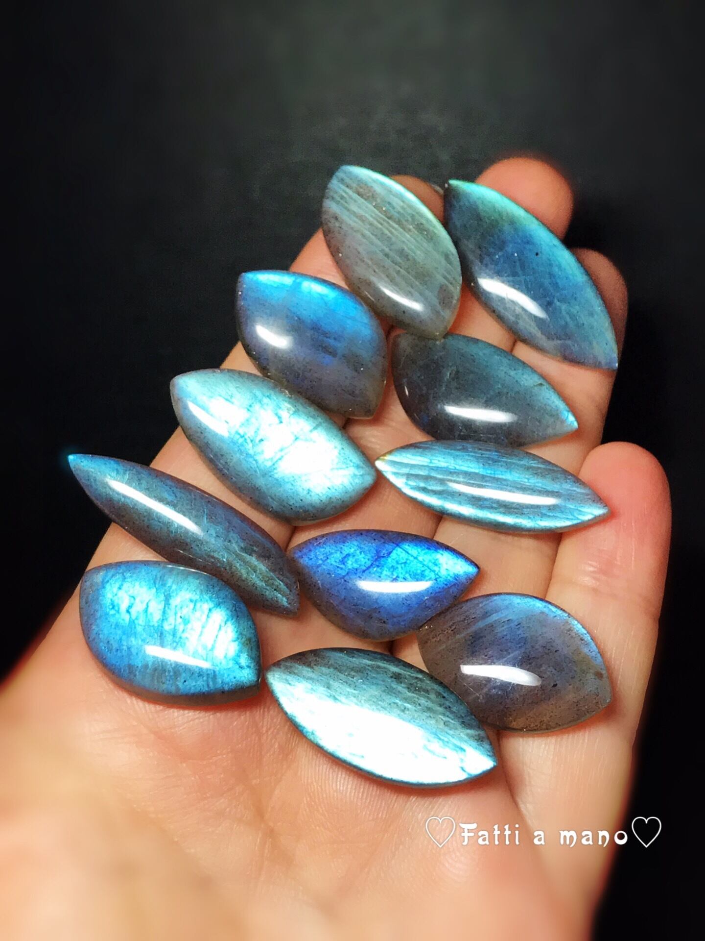 ※ラブラドライトは光源や見る角度によって発色が異なる石ですので、その旨ご了承下さい。撮影には蛍光灯の光を用いています。
