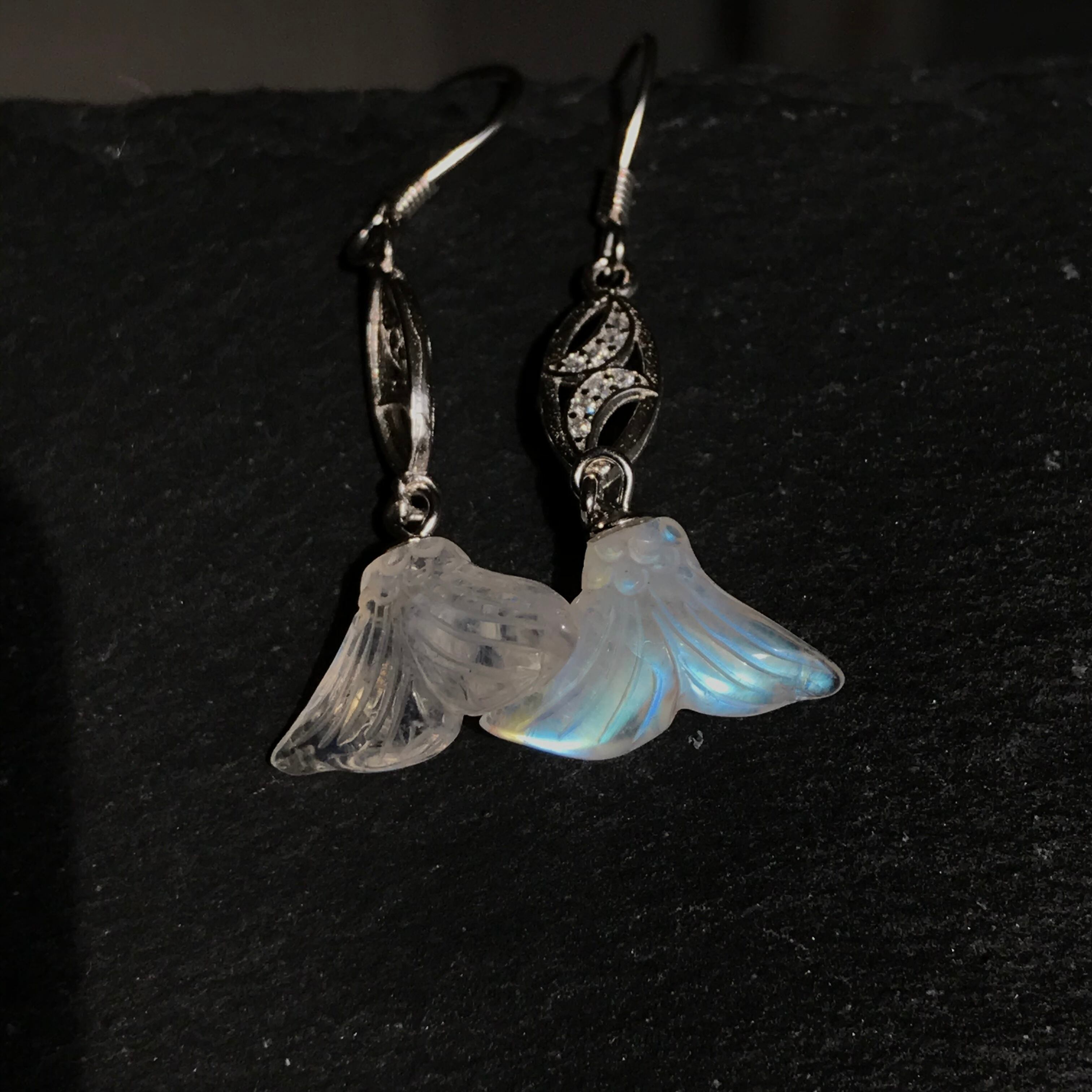 手彫りロイヤルブルームーンストーンのホエールテールピアスです
