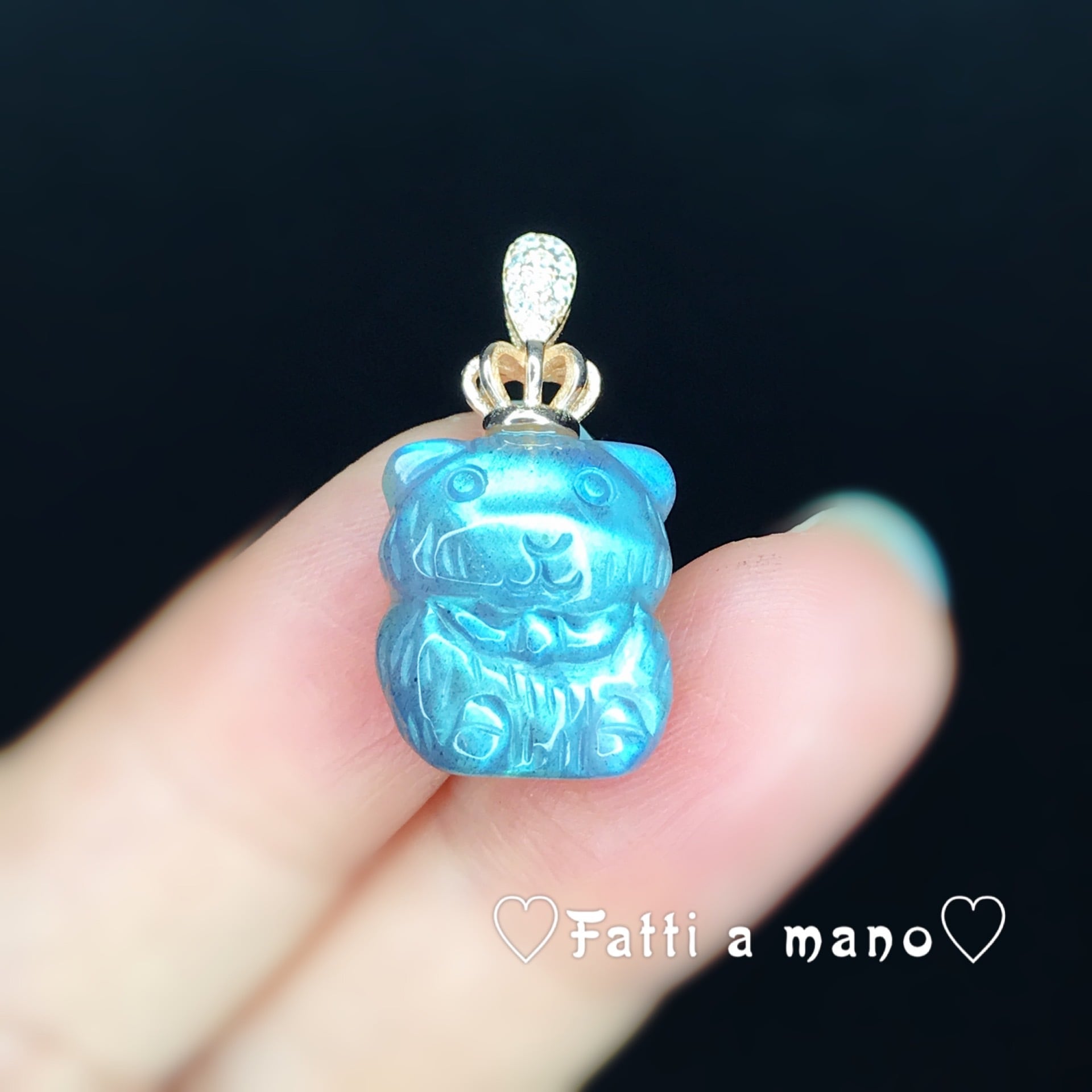 ※ラブラドライトは光源や見る角度によって発色が異なる石ですので、その旨ご了承下さい。撮影には蛍光灯の光を用いています。