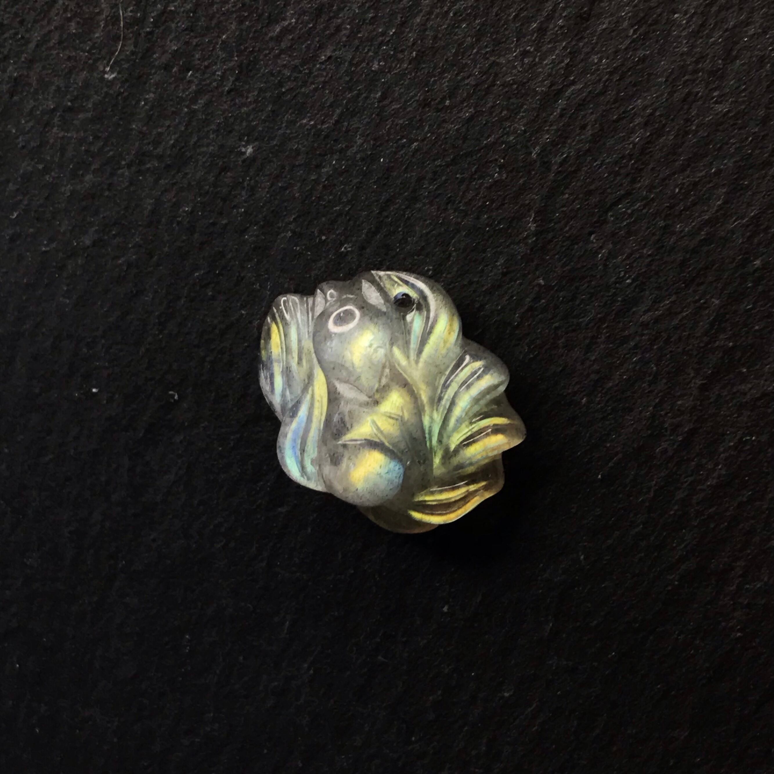 ※ラブラドライトは光源や見る角度によって発色が異なる石ですので、その旨ご了承下さい。撮影には蛍光灯の光を用いています。